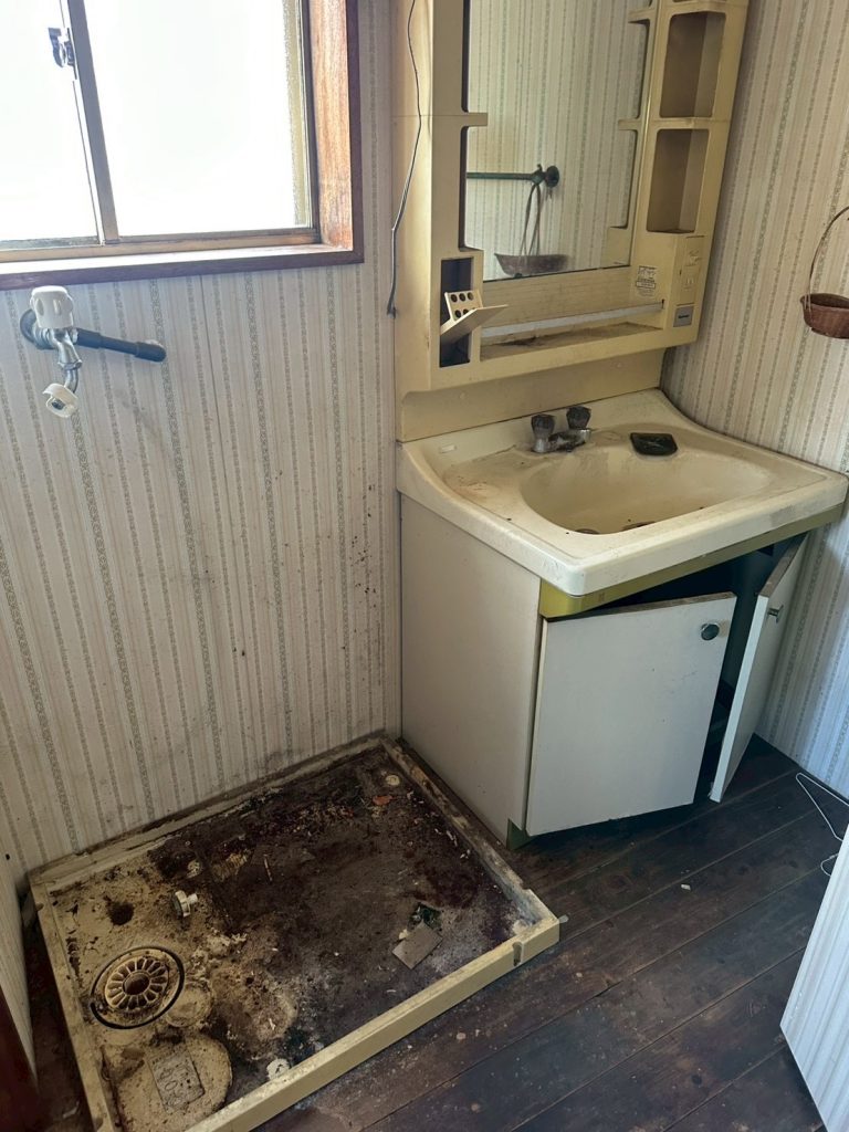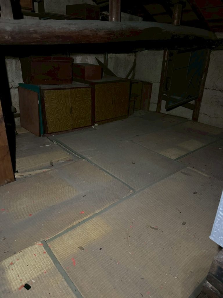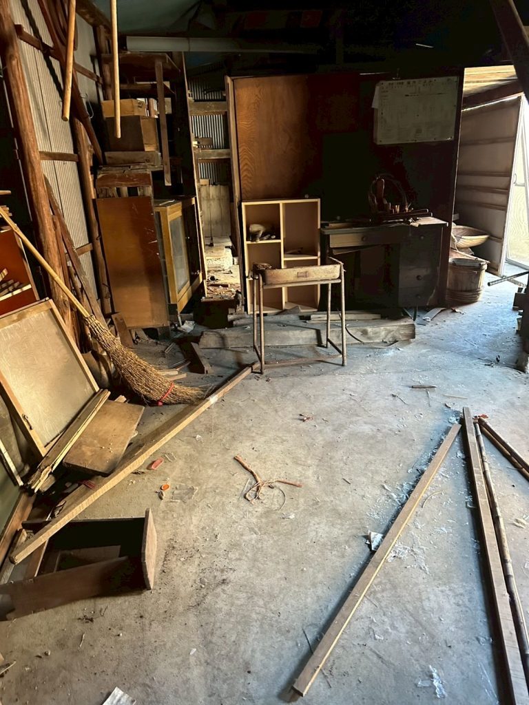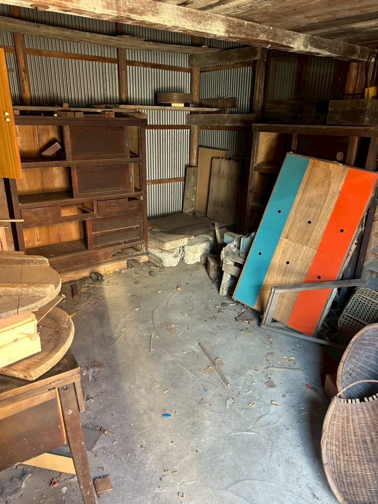 - 蔵・倉庫:天井の梁部分まで物が積み上げられ、大量の古家具、傘、ロープ、農具、ガラクタなどが長年放置された状態です。特に、古びた洗面台(水回り)や、埃と木くずが積もった廊下など、家屋全体にわたって大掛かりな片付けが必要でした。