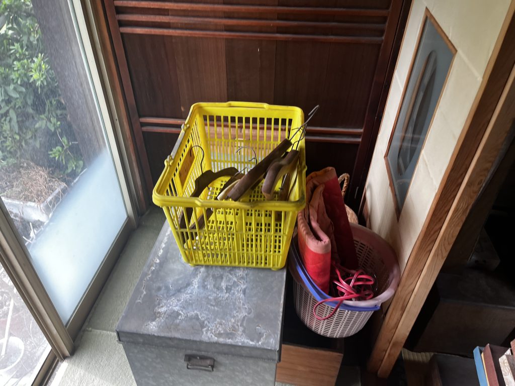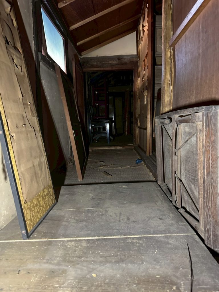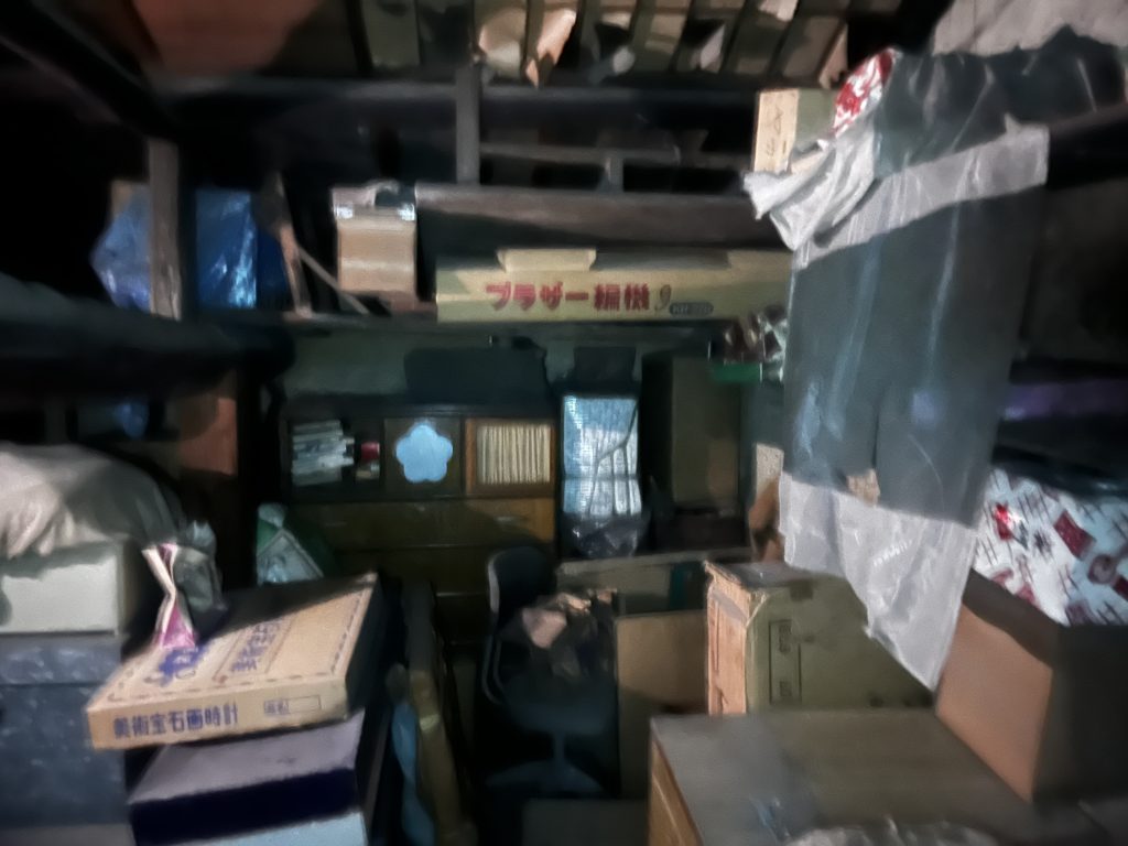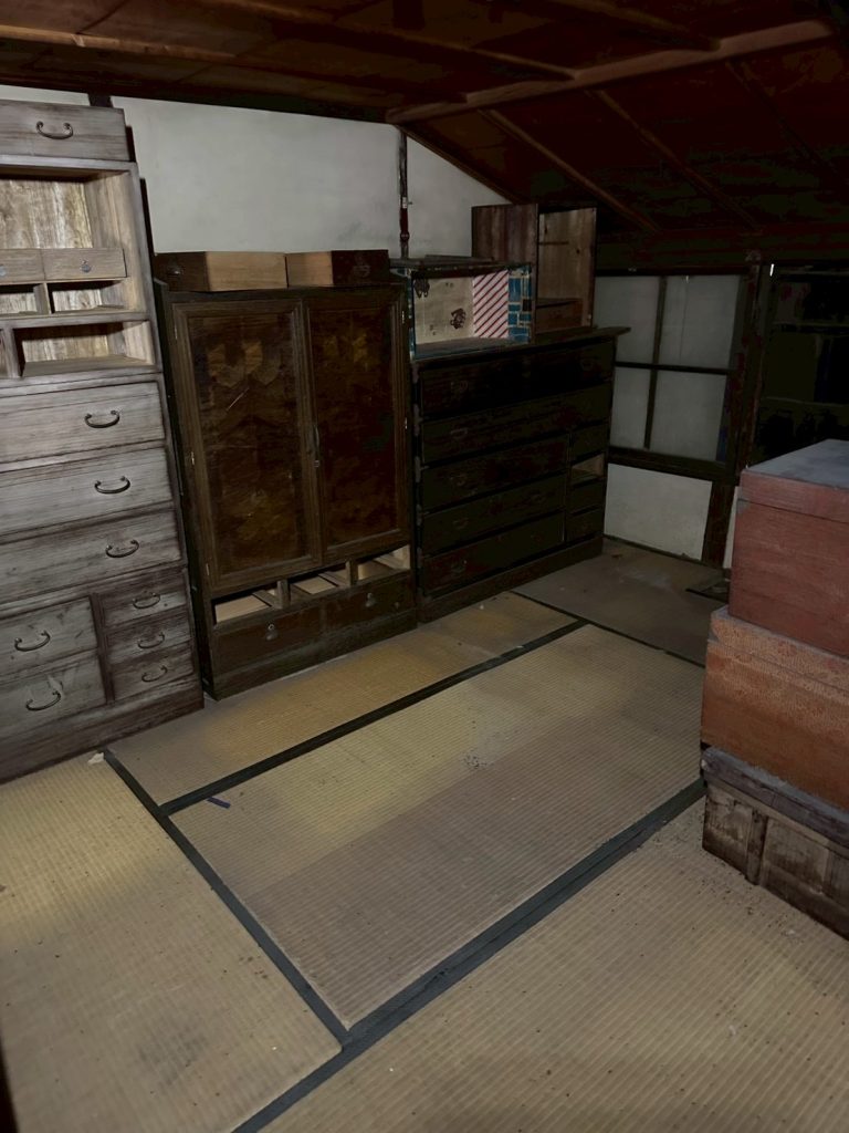 - 蔵・倉庫:天井の梁部分まで物が積み上げられ、大量の古家具、傘、ロープ、農具、ガラクタなどが長年放置された状態です。特に、古びた洗面台(水回り)や、埃と木くずが積もった廊下など、家屋全体にわたって大掛かりな片付けが必要でした。