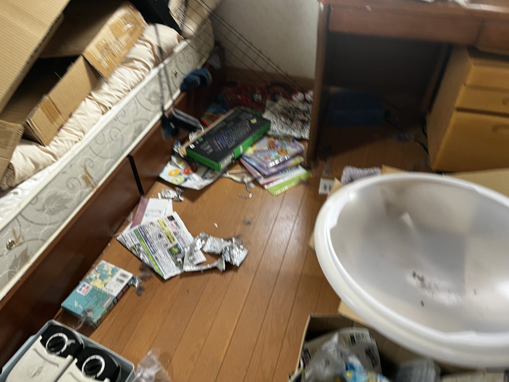 複数の部屋(和室、洋室)にわたって物が散乱し、床面積のほとんどが埋まっていました。