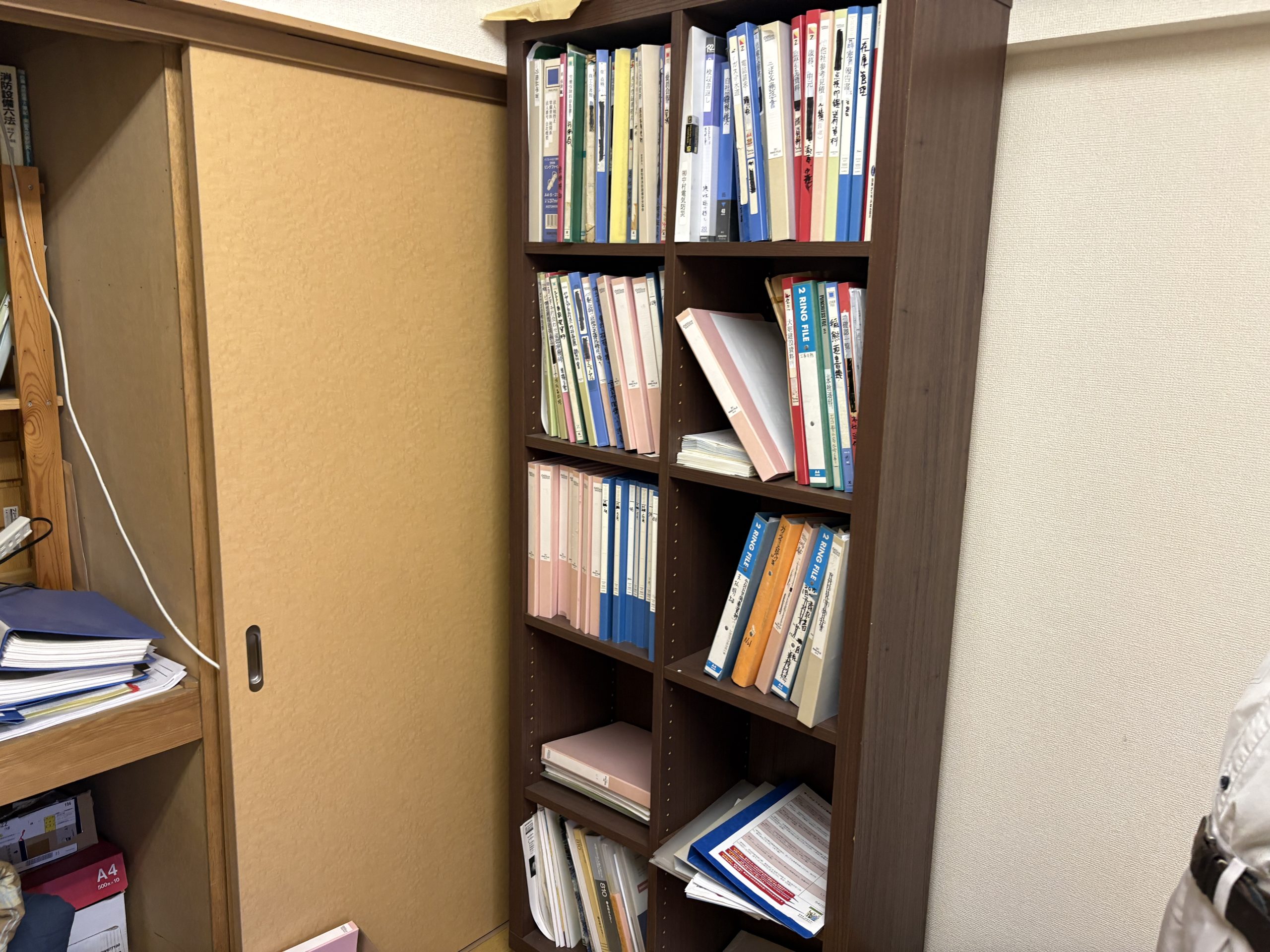 本棚にはファイルや専門書がぎっしりと詰まっていました。紙類はまとまると非常に重量があり、運び出すだけでも重労働です。